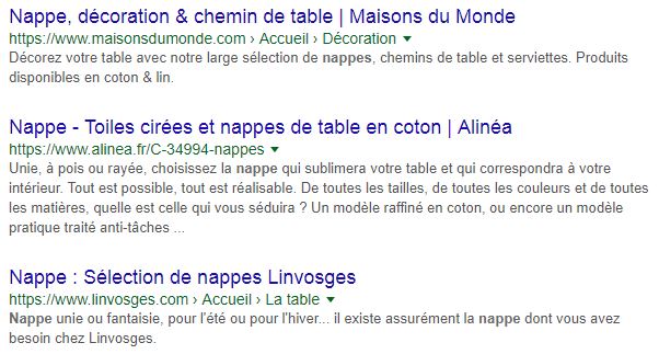 • les marques associées, car quelqu’un qui tape « nappe ikéa » cherche quelque chose de précis et il vaut mieux l’exclure.