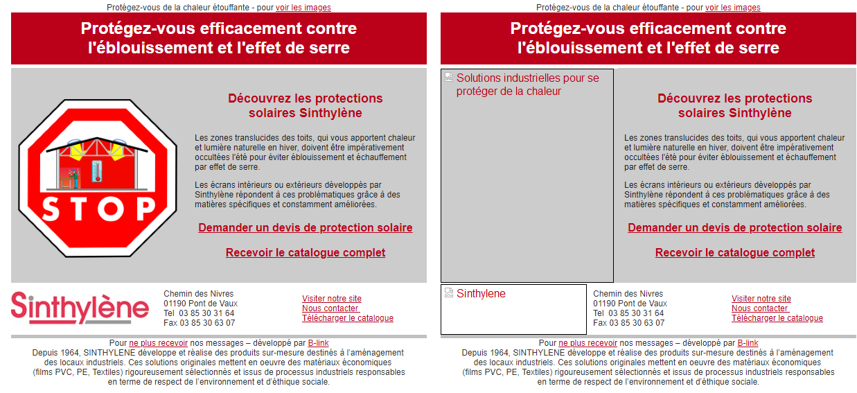 Plus vous serez en B2B, sur des solutions professionnelles (Outlook, Thunderbird), plus les images seront bloquées. On arrive à 80% de personnes qui ne voient pas les images en B2B (source EMA B2B SNCD). En B2C, la forte utilisation des smartphones augmente l’affichage des images pour les rendre utiles dans les propositions graphiques.