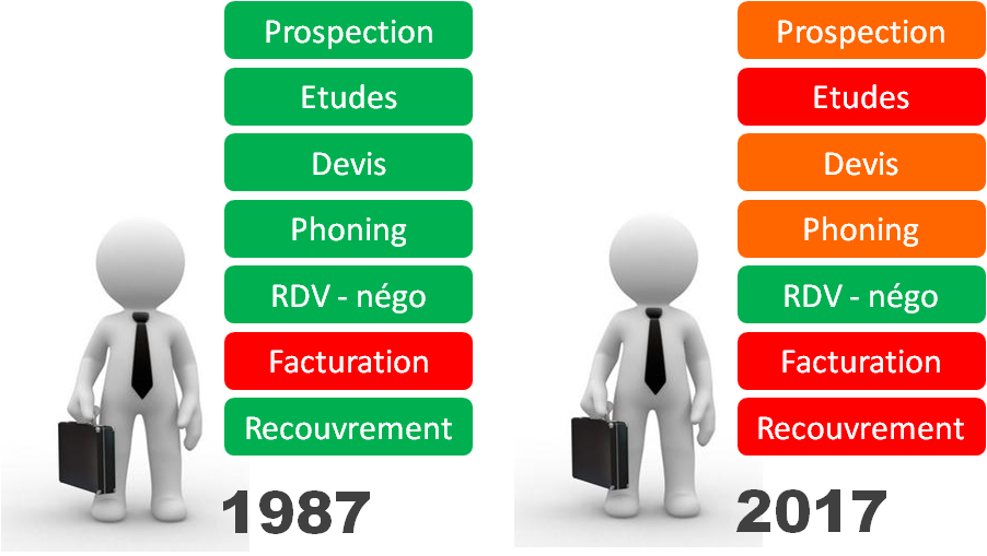 Le commercial a considérablement évolué et son rôle en 2018 est de passer le maximum de temps en négociation avec le client. Pour ce faire, on le décharge de beaucoup de tâches qui lui incombaient auparavant comme la prospection, le chiffrage, les relances ou le recouvrement. Ceci implique que le commercial doit interagir avec de nombreux services support au siège (marketing, centre d’appel, bureau d’étude, services techniques, SAV…Etc.) et un outil collaboratif et le bienvenu.