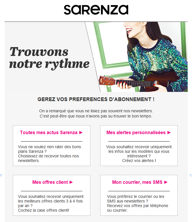 – Mettre en place un preference-center qui permettra une alternative au désabonnement en proposant de limiter les thèmes ou la fréquence des envois. Certains sites proposent des « pauses » pendant les vacances par exemple.