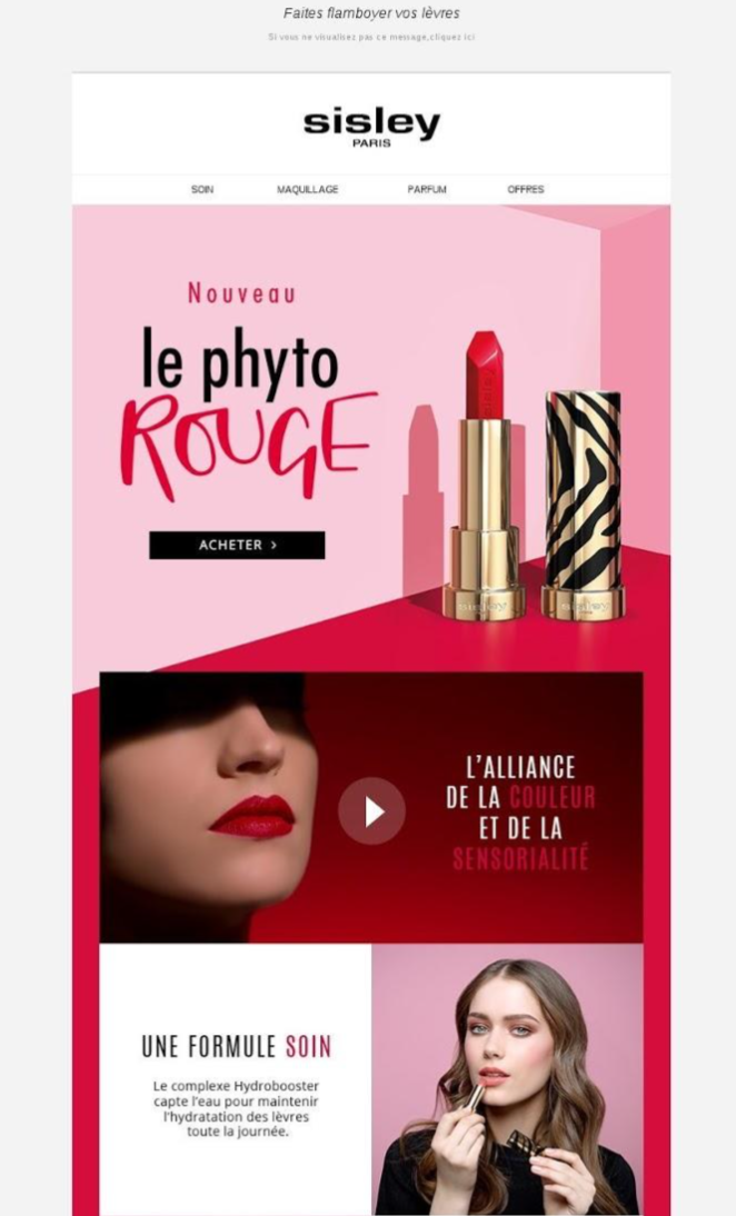 Dès l’ouverture d’un email marketing votre cible doit comprendre rapidement votre message sans avoir à rechercher l’information. Il faut donc aller à l’essentiel. Les tendances graphiques ont montré qu’il était bon de miser sur une construction d’e-mail simple et épuré mettant l’accent sur les boutons call-to-action. Il ne faut pas chercher à faire un catalogue de vos produits ou de vos contenus. Cette tendance de l’extra light ou encore le “less is more” permet de libérer le visuel et le message pour le rendre plus lisible. Par exemple :